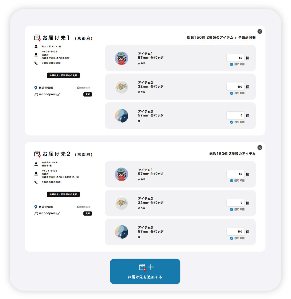 お届け先を複数箇所ご選択いただけるようになりました。